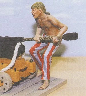 This gunner wields a ramrod and sponge made from a short section of rope. The rammer was used to ram powder cartridges, felt wads and cannon balls into the gun barrel. The sponge, soaked in water, was designed to extinguish any bits of wad or cartridge which still smouldered in the barrel before reloading a fresh charge. Training and discipline enabled British gunners to maintain a much higher rate of fire than their contemporaries and this was a crucial factor at Trafalgar.