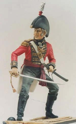 In an action stance in similar vein to his colleague and brother officer, the Naval Lieutenant and perhaps fighting along side him to repel boarders. His uniform is much more colourful as befits an officer whose unifrom reflects his association with the Army rather than the Senior Service.