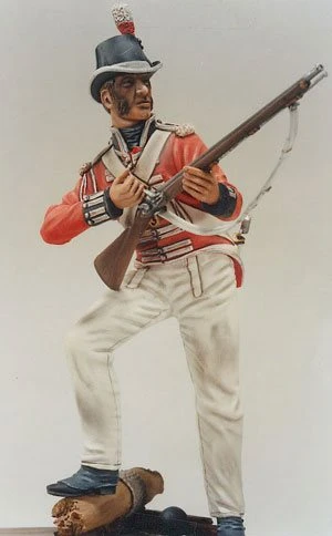 This figure is depicted in action during the Battle. His right foot rests on a piece of shattered spar and he is cocking his musket ready to fire another ball. His uniform is dirtied by his involvement in the action but it is still easy to imagine him on parade, with his brasses polished and his belts pipe clayed. His sideburns and coarse features mark him out as a member of the crew on the lower decks.