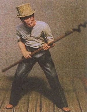 This figure indicates the wide variety of dress adopted by the gun crews on Victory. They universally had bare feet, one to avoid slipping on a wet deck and two to avoid any possibility of a spark with the inevitable spillage of powder grains. This model shows a crewman equipped with a worm, designed to allow the extraction of wads or other obstruction left in the gun barrel. The superiority of British naval gunnery was maintained by trained members of the gun team dealing with any eventuality that might interfere with the continuous firing of the gun.